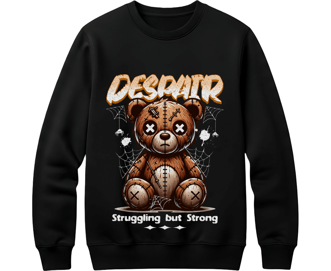 Despair Teddy Bear Sweatshirt – Struggling But Strong Black Graphic Crewneck