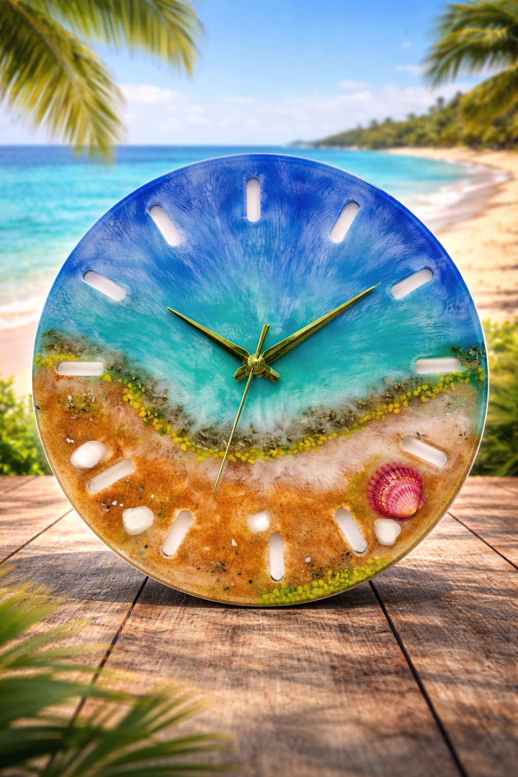 Luxury Handmade Epoxy Resin Beach Clock – Ocean Wave Wall Clock with Real Sand & Shells – Coastal Resin Art Clock – Unique Beach House Decor – SAMZ24