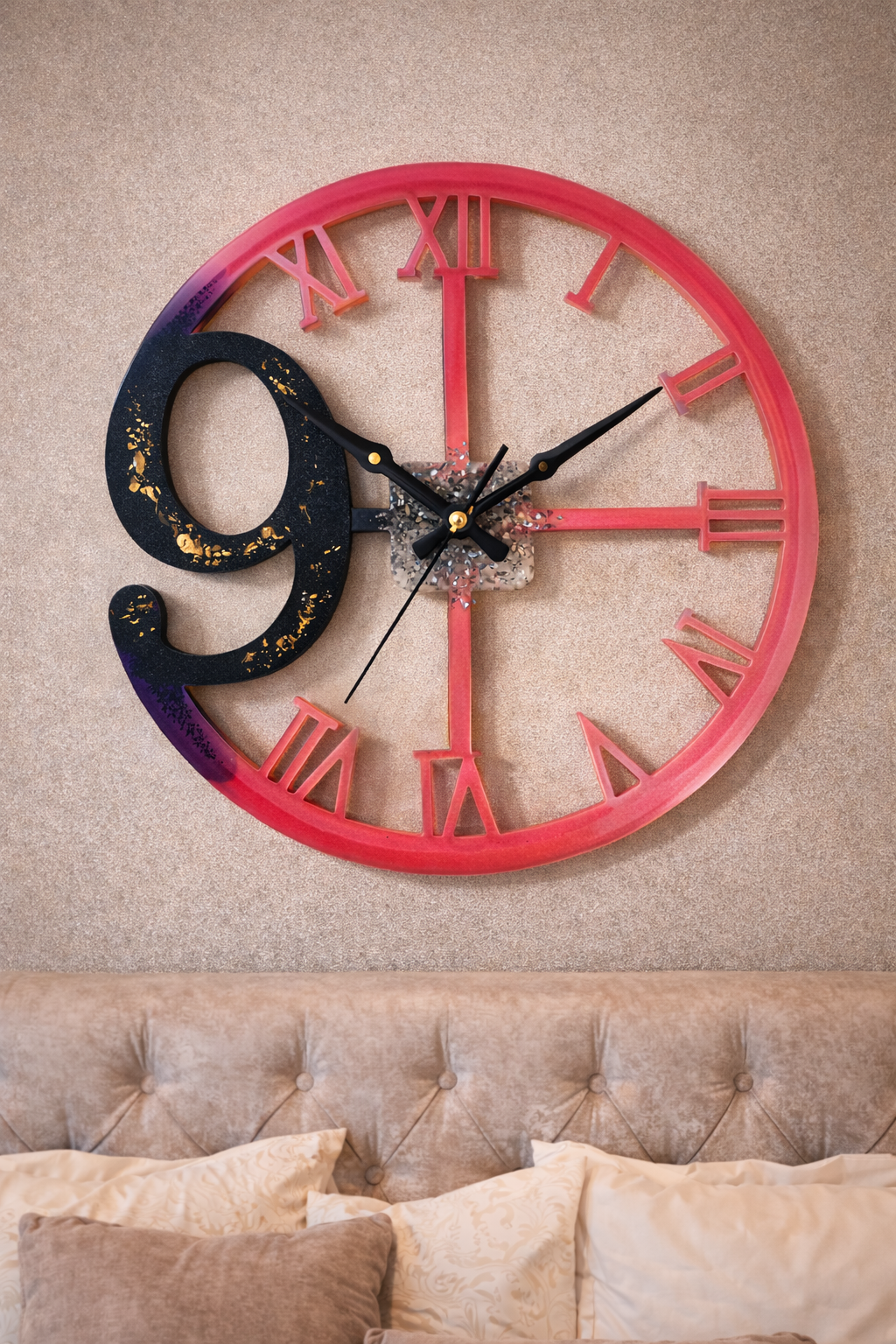 Handmade Pink & Black Epoxy Resin Wall Clock – Modern Roman Numeral Resin Clock with Decorative Number 9 – Artistic Wall Decor – SAMZ24