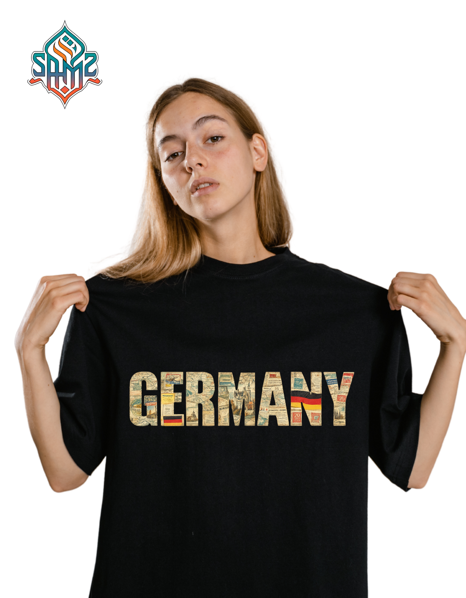 The bold lettering features a retro scrapbook-style collage made from vintage travel elements like maps, postcards, newspaper clippings, stamps, travel tickets, and aged paper textures. Inspired by classic retro travel posters and vintage atlas artwork, this design gives your shirt a unique artistic look.